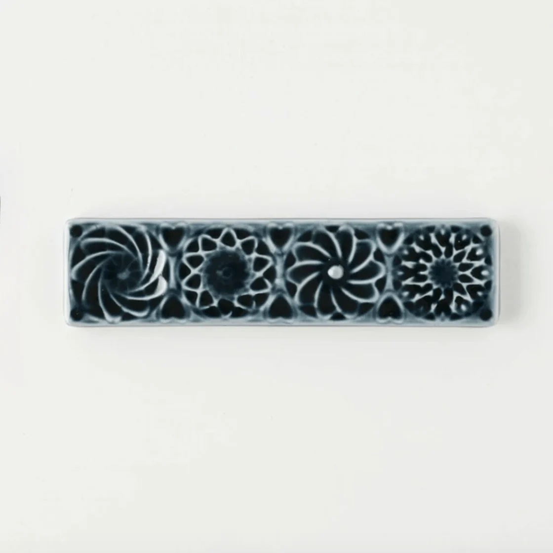 Bring an element of quiet beauty and functionality to your table setting with this Botanical Motif Cutlery Rest. Perfectly sized to hold chopsticks, forks, or spoons, it keeps your table neat while adding a touch of Japanese craftsmanship. The intricate floral relief pattern, finished in a rich navy glaze, blends timeless elegance with modern minimalism.