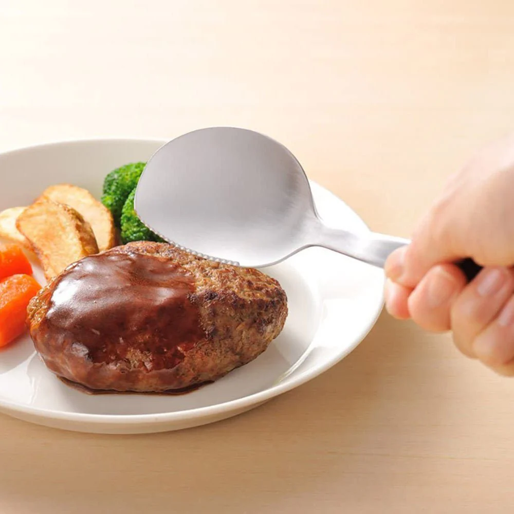 The Cut & Serve Spoon is designed to replace the awkward handoff between knife and serving spoon, letting you portion food and serve it directly at the table—cleanly, calmly, and without switching tools.